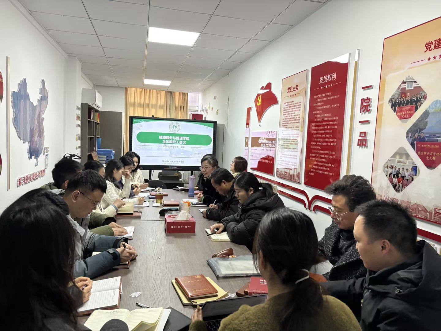 2026年1月16日,我院召开全体教职工会议,健康服务与管理学院书记王保升、院长王晓斐及全体教职工参会。