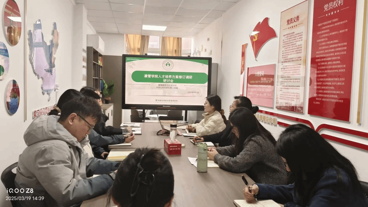 为深入贯彻落实国家职业教育改革要求,进一步优化康养类专业人才培养体系,3月19日下午,康养教研室在洞山校区崇师楼308会议室召开专业人才培养方案修订专题研讨会。会议由教研室主任黄凯萍主持,院长王晓斐以及康养教研室全体教师参会。