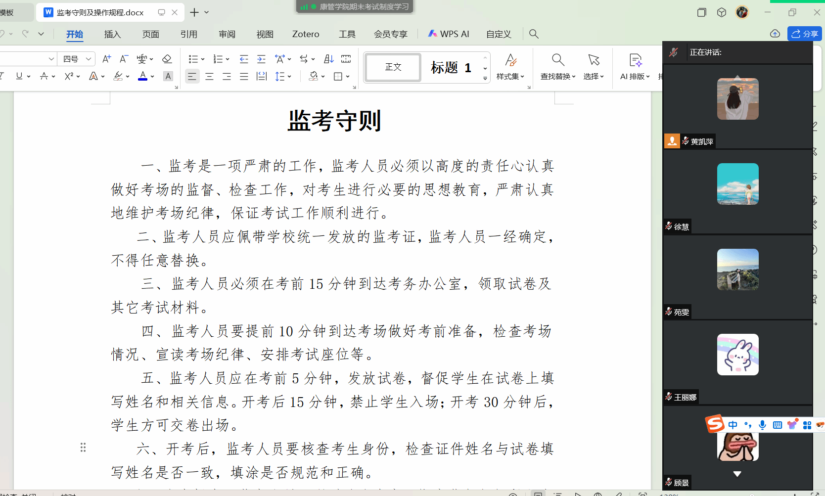 为规范监考流程,严肃考风考纪,保障学院考试工作公平公正进行,健康服务与管理学院于6月30日召开线上会议,组织全体教师开展了“监考守则及操作规程”专题学习活动。本次活动由康养教研室主任黄凯萍主持。学院全体监考教师参会。
