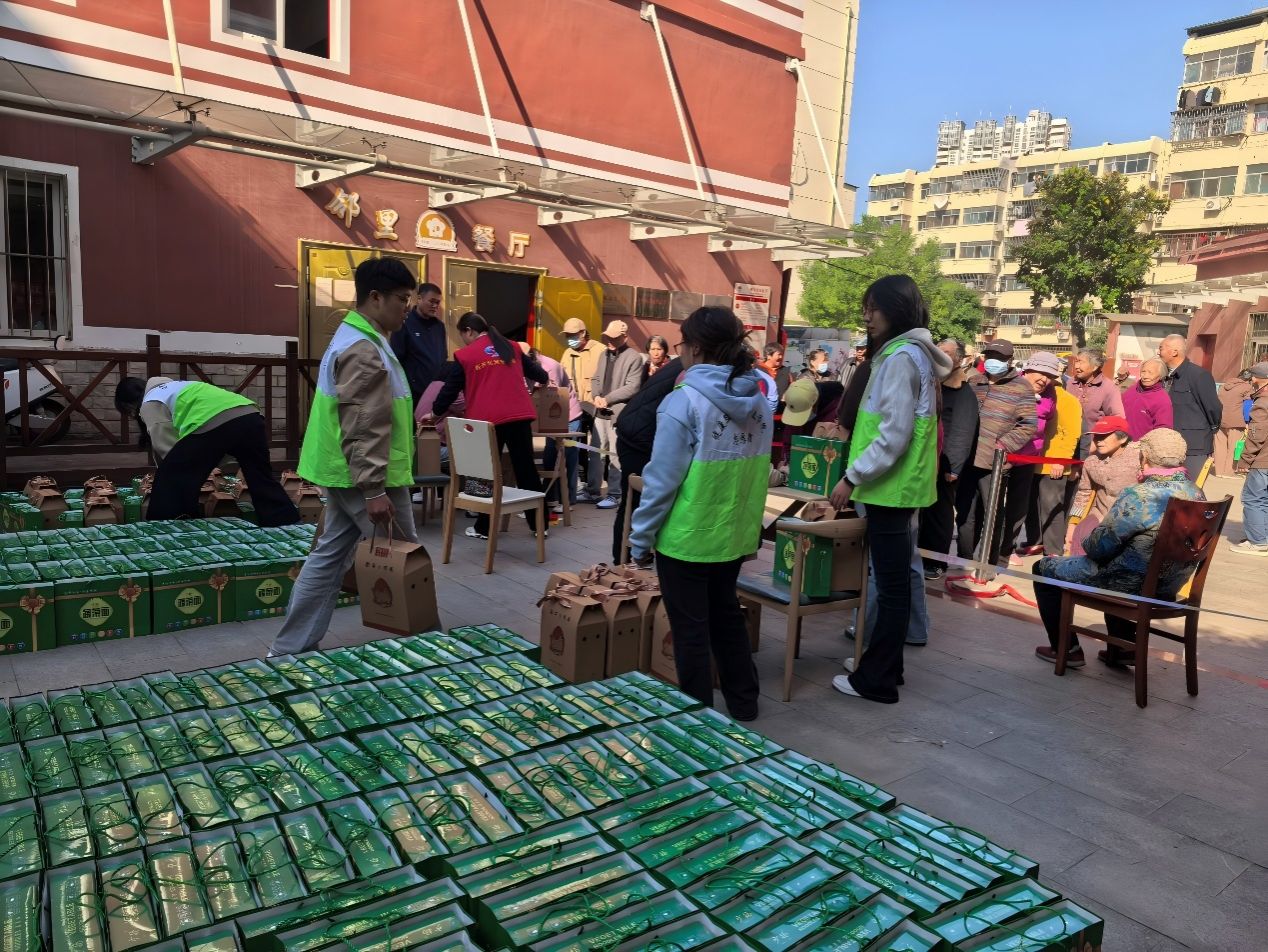 活动当日,石桥社区暖意融融,恰逢社区为年满60周岁及以上的老年居民集中发放重阳节日慰问品。“天伦乐”志愿者服务队的同学们抵达现场后,迅速进入状态,大家提前分工、各司其职,搬运物资时步履稳健,清点数量时细致核对,分装物品时条理分明,整个流程衔接顺畅、井然有序,成为社区里一道活力满满的青春风景线。